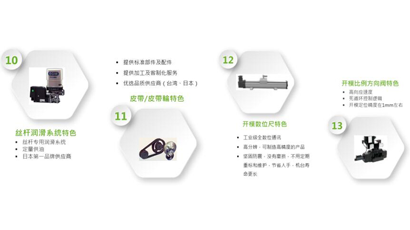射出結(jié)構(gòu)選配線性導(dǎo)軌支撐,確保射出物理摩擦小,運(yùn)動(dòng)速度控制更精密、能耗更低。